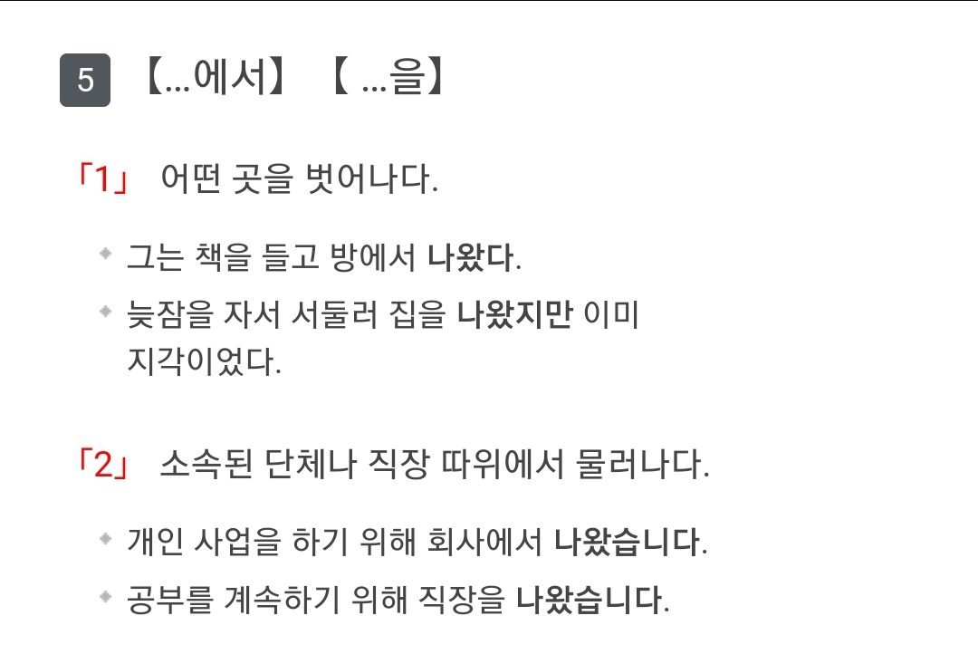 [1] 어떤 곳을 벗어나다. [...에서 / ...을]
