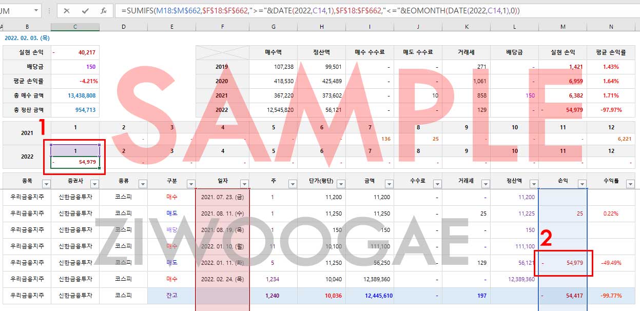 =SUMIFS(손익 열(M),일자 열(F),">="&DATE(년(2022),1월(C14),시작일(1)), 일자 열(F),"<="&EOMONTH(DATE(년(2022),1월(C14),시작일(1),0))
