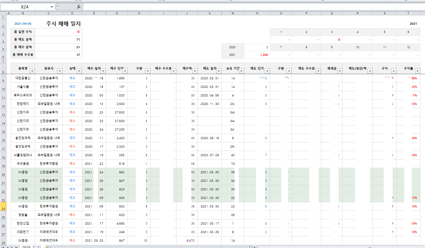 그래도 원하는 기능을 추가해 줬다. 수수료(매수.매도), 제세금, 수익률, 매도(정산)액, 월별 수익 SUMIFS 함수랑 SUMPRODUCT 함수 등등